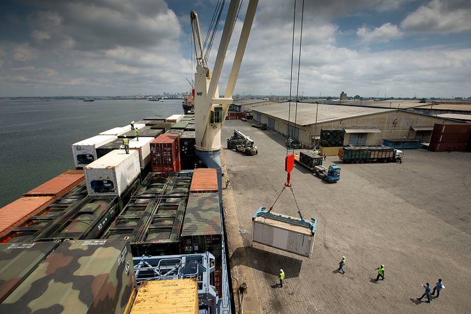 Het door de Verenigde Naties (VN) gecharterde schip vaart de haven van Abidjan binnen.