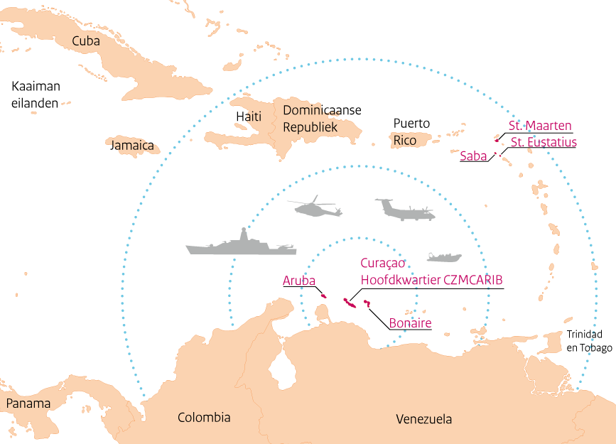 De omstandigheden waar de commandeur op doelt, liggen verscholen in twee van de drie hoofdtaken die het ministerie van Defensie heeft. “Wij zijn in het Caribische gebied voornamelijk bezig met anti-drugsoperaties en het tegengaan van de smokkel van mensen en wapens”, verklaart hij . “Dat kunnen we niet alleen in zo’n enorm gebied, daar hebben we partners voor nodig. Dat zijn bijvoorbeeld de Fransen, de Amerikanen en de Britten. Maar ook de eilanden en landen die om ons heen liggen zoals de Dominicaanse Republiek, Puerto Rico en Colombia.”