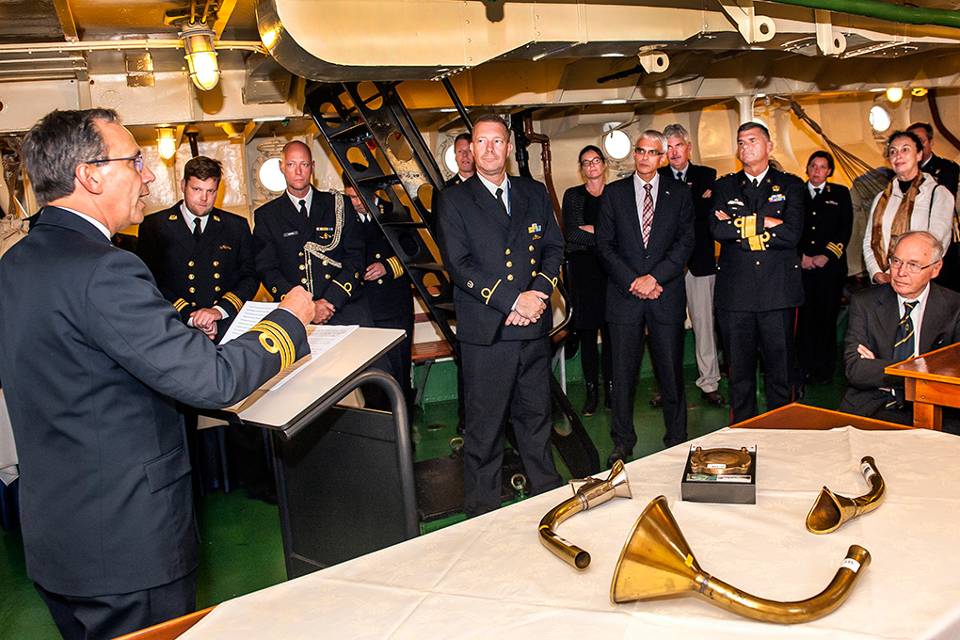 C-ZSK luitenant-generaal der mariniers Rob Verkerk is net als schout-bij-nacht b.d. Jan Spoelstra onder de indruk van één van de terug gevonden spreekbuizen van Hr.Ms. De Ruyter.
