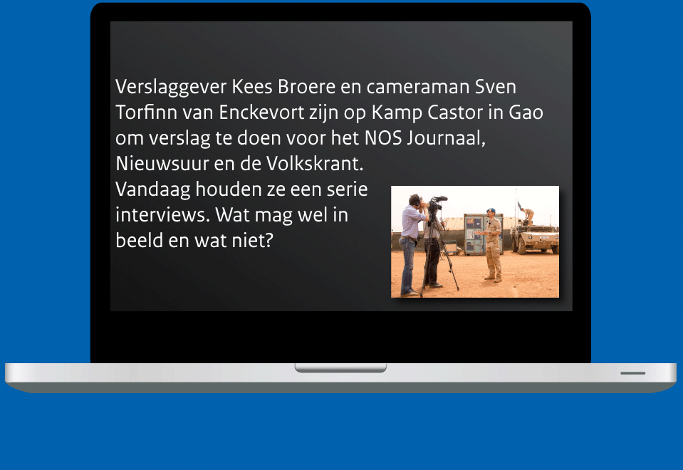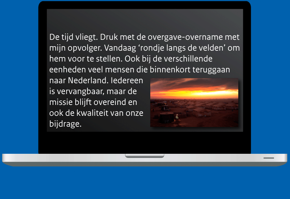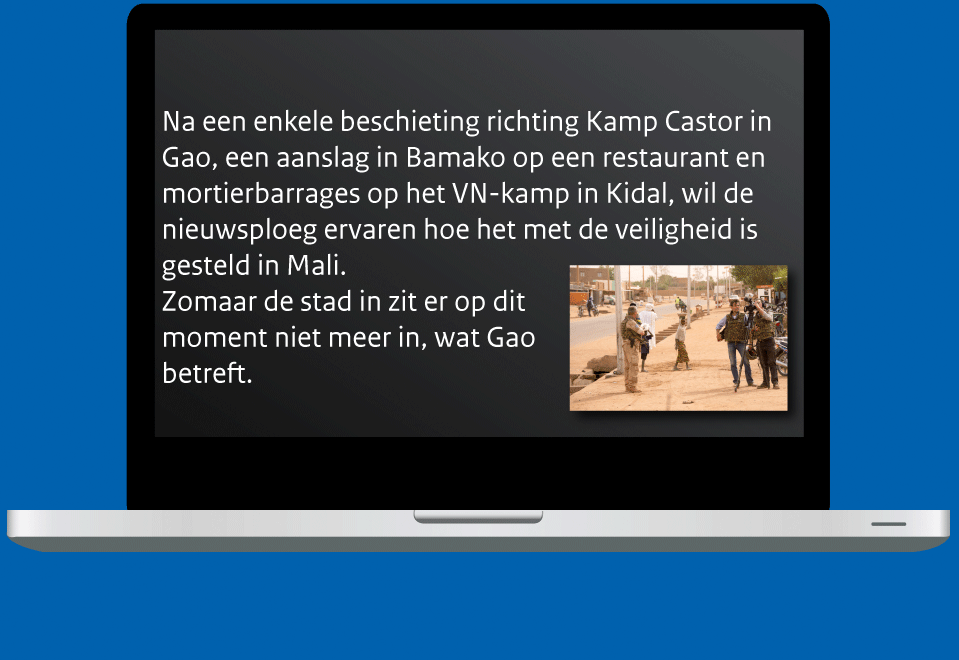 Luitenant ter zee 2OC (SD) Joost Margés werkt normaal gesproken als communicatieadviseur bij de Directie Communicatie in Den Haag. De afgelopen 5 weken verruilde hij de hofstad voor een compleet andere werkomgeving: Mali. Hij was uitgezonden naar Gao als Public Affairs Officer (PAO, persvoorlichter). Een kleine greep uit zijn belevenissen binnen het Nederlandse Contingent van de VN-missie MINUSMA.