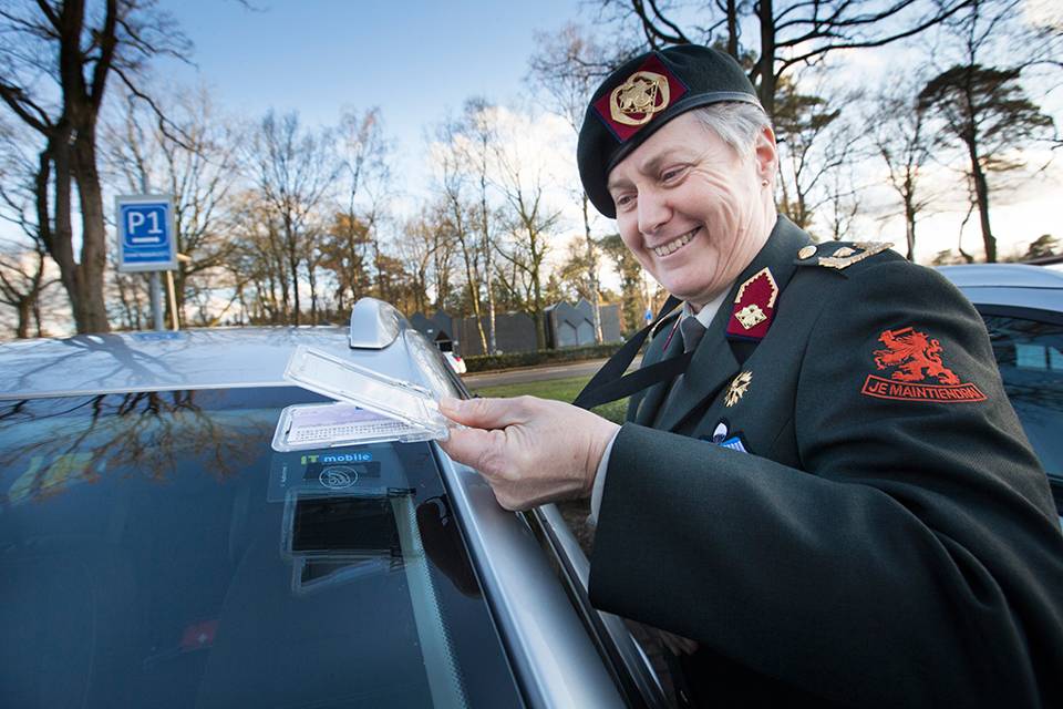 Door haar Defensiepas tegen de kaartlezer van een dienstauto te drukken, ‘opende’ brigadegeneraal Leanne van den Hoek van het Commando DienstenCentra op 3 maart het PNOD. Foto: Hans Roggen