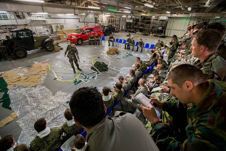 Voor de laatste acties tijdens Joint Warrior kregen mariniers een levensgrote ‘kaart’ voorgeschoteld aan boord van het Britse landing platform dock en helicopter carrier HMS Ocean.