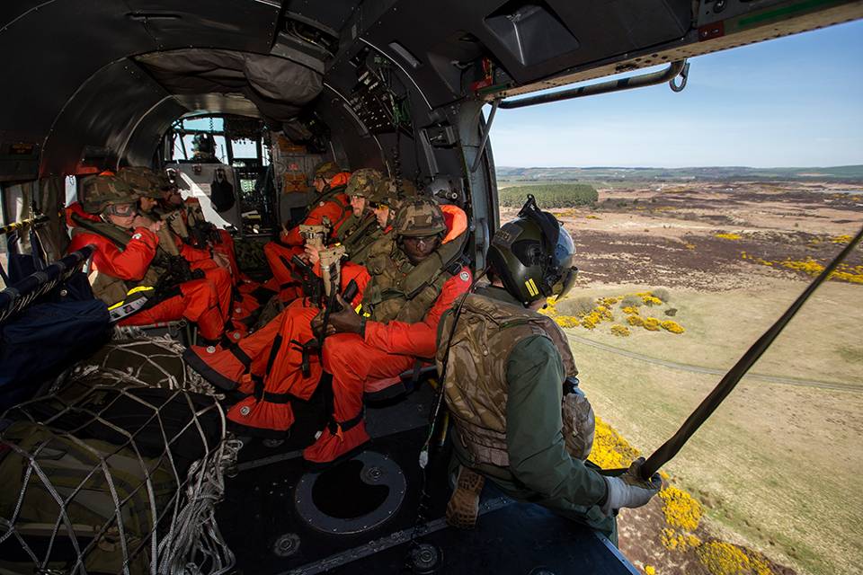 Mariniers maakten gebruik van Britse Chinook en Sea King helikopters om zich te verplaatsen.
