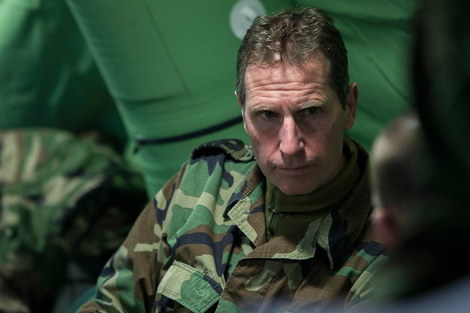 De officieren staan continu over kaarten van het oorlogsgebied in Zuidwest-Schotland gebogen. De ene briefing na de andere volgt. “We moeten hier snel schakelen van offensief naar het tegenovergestelde”, vertelt majoor der mariniers Bert Odding van 2 MCG. ’s Nachts worden verzetshaarden van terroristen opgeruimd. “Maar overdag is het baret op en patrouille lopen om de bevolking gerust te stellen. Het gaat dan om smile and wave, juist niet dreigend overkomen. Die omschakeling vergt veel van staf en mariniers.”