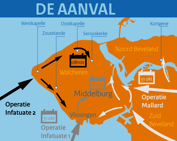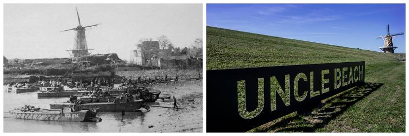 De eerste aanvalsgolf bestaande uit manschappen van No 4 Commando landt op de glooiing van de dijk bij de Oranjemolen (Uncle Beach) in Vlissingen. De molen is nog steeds een markant herkenningspunt op de dijk.