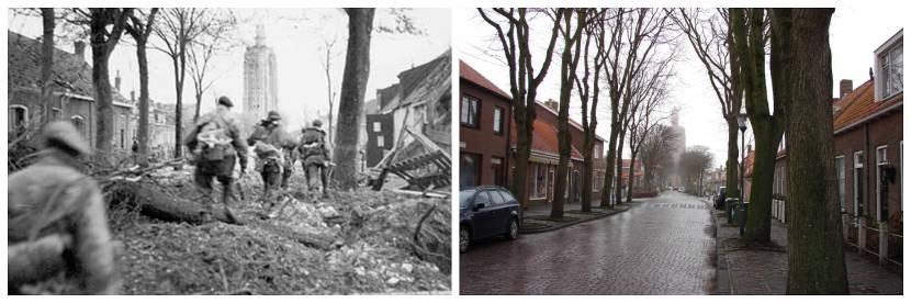 Oprukkende Britse commando's in het dorp Westkapelle, met op de achtergrond de kenmerkende vuurtoren. Aan het straatbeeld is amper iets veranderd.
