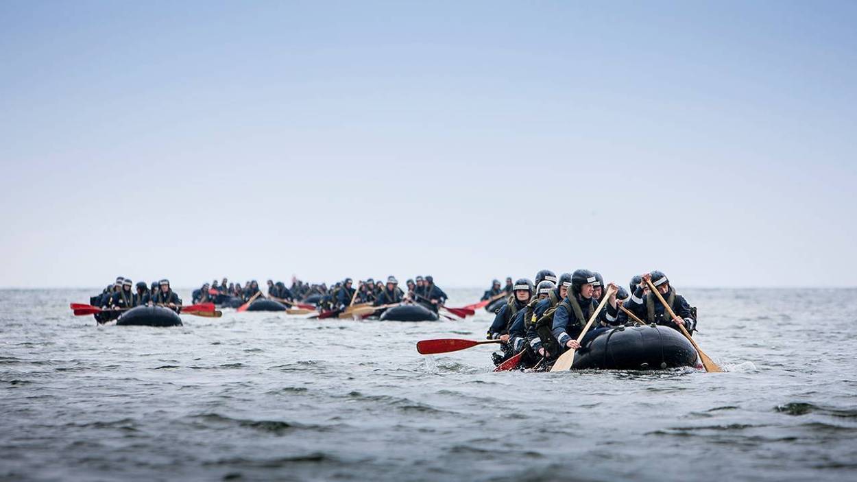 De volgende dag is het weer tijd voor actie; rubberboot op de schouders en stompen over het eiland. Over de bunker, door de duinen en door naar het strand. Met een straffe wind tegen vervolgen de aspiranten daar hun weg, terwijl de boot naar Den Helder op de achtergrond traag voorbijvaart. Baksoudsten delen korte bevelen uit, mensen jutten elkaar op. ‘Texel doe je samen’, zo klonk het een dag eerder al. En waarom ze überhaupt aan de officiersopleiding begonnen? Van de antwoorden kun je een reclamebrochure maken: uitdaging, saamhorigheid, afwisseling, reizen, avontuur.