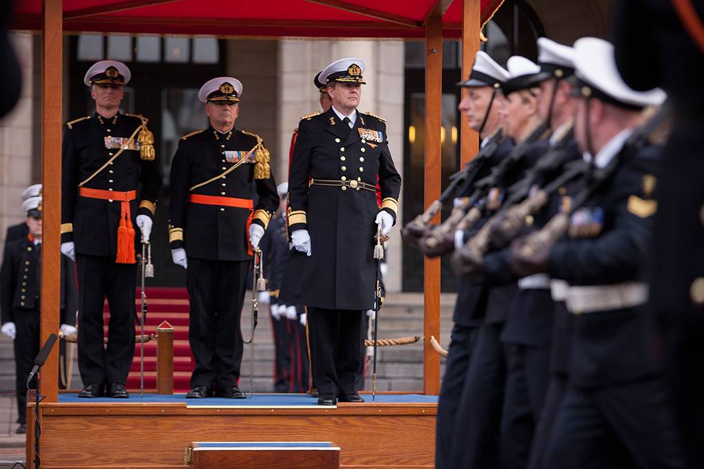Het defilé wordt afgenomen door koning Willem-Alexander. Achter hem, van links naar rechts: Commandant van het Korps Mariniers, BRIGGENMARNS Richard Oppelaar, Commandant Zeestrijdkrachten, LTGENMARNS Rob Verkerk en de Chef Militair Huis, GENMAJ Hans van der Louw.