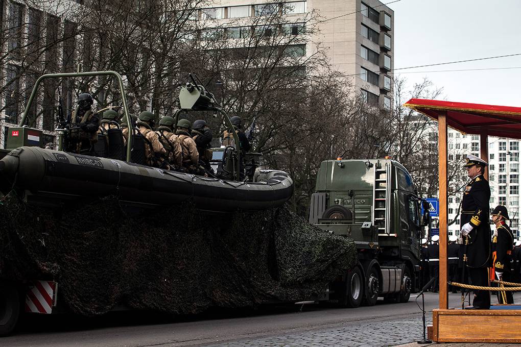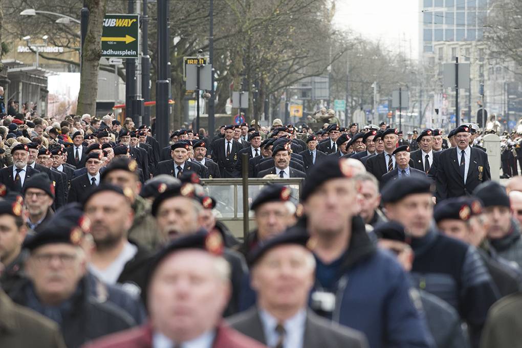 “Rotterdam lijkt wel een oorlogsgebied”, merkt een voorbijganger op. 4-tonners blokkeren de toegangswegen naar de Coolsingel, Volkswagens Amarok rijden af en aan en op elke straathoek staan militairen met de karakteristieke blauwe baret met rood padje en de rode bies op de broek. Onder begeleiding van de Marinierskapel en de Tamboers en Pijpers komen 2.000 (oud)-mariniers aangemarcheerd. Ze stellen zich op voor het Rotterdamse stadhuis.