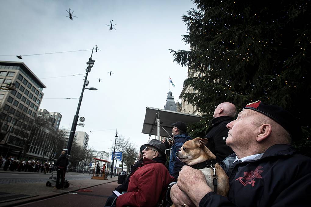 Als de laatste marinier de Coolsingel verlaat, komt ook het luchtdefilé over: 2 Cougars, 2 NH-90’s en 2 Britse Sea Kings. Een C-130 Hercules transportvliegtuig sluit het defilé af.