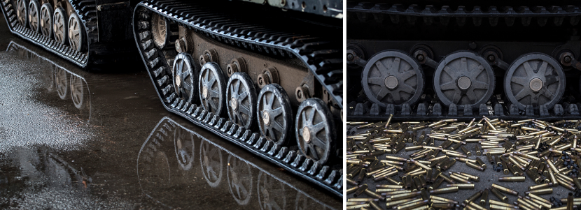 Vanuit zijn koepel op een Viking-pantservoertuig vuurt een marinier van 24 Combat Support Squadron een reeks salvo’s met een .50-mitrailleur af. De atmosfeer is zwanger van het lood.
