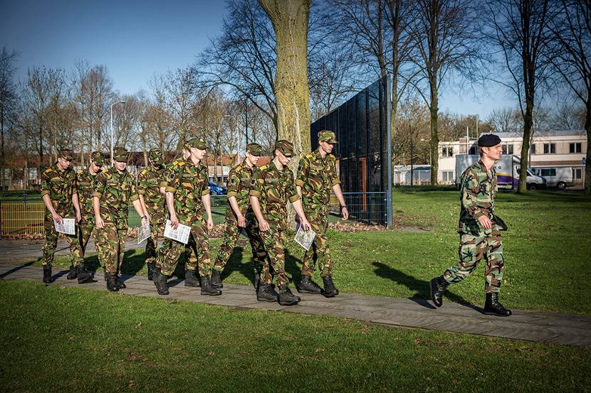 Al dat praten over én onderkennen van ieders sterke en zwakkere kanten betekent niet dat de militair-instructeur watjes aflevert na 2 of 3 jaar opleiding. “Het is ook doorbijten en gáán. We leiden hier wel op voor een elite-eenheid,” vervolgt hij streng. “Iedere marinier bereikt een keer een punt waarop hij denkt dat hij aan de max van zijn kunnen zit. Meestal kan hij dan nog wel een stapje verder en doet dat dan ook. Je sleept elkaar er doorheen.”