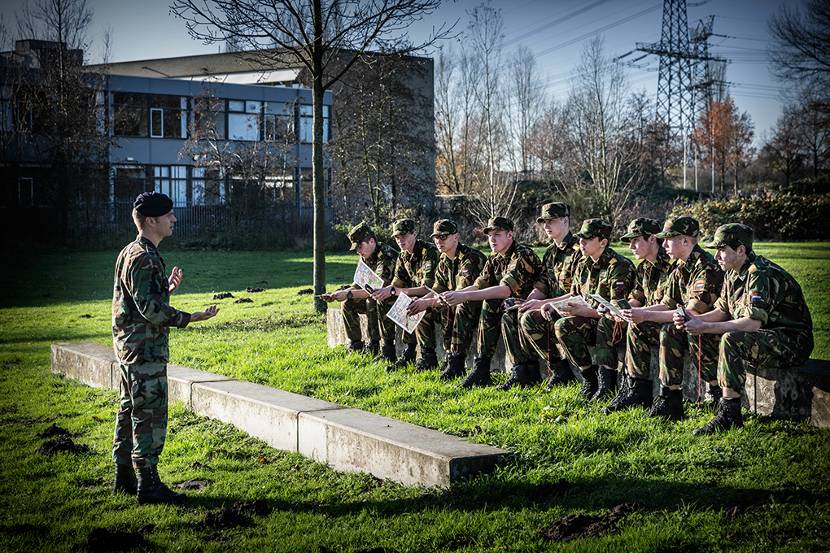 Bijkerk maakte 18 jaar geleden zijn droom waar. Naast operationeel marinier is hij tegenwoordig ook ‘voorbeeldmarinier’, in zijn rol als militair instructeur op het ROC. “Ik plaats mezelf niet op een voetstuk hoor; ook ik heb mijn onzekerheden.” En die steekt de sergeant niet onder stoelen of banken tijdens zijn lessen. “De eerste orderuitgifte vond ik bijvoorbeeld ook spannend”. Door dergelijke ervaringen te delen en niet direct over elkaar te oordelen, creëer je een veilige leeromgeving. Mijn leerlingen durven hierdoor dingen te proberen en gaan positief om met feedback. Angst voelen bij een oefening op de klimtoren is bijvoorbeeld niet erg. De vraag is of je de kans pakt die angst te overwinnen. En zo heeft iedereen wel iets dat verbeterd kan worden. Door dit bespreekbaar te maken leer je elkaar écht kennen; daardoor krijg je een sterk team.”