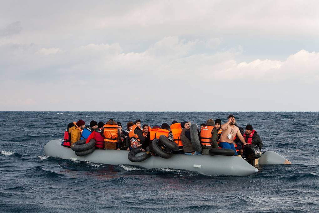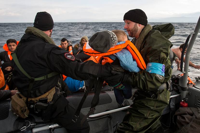 De overbeladen rubberboot stroomt deels leeg. Een aantal doorweekte vrouwen en kinderen neemt plaats in de FRISC. “Het blijft bizar; ze nemen zoveel risico”, leggen Siemelink en Zijlstra uit. “Die boten zijn veel te zwaar beladen en hebben een slechte motor. Zij zitten er met meer dan 50 mensen in, terwijl 10 het maximum is. En die zwemvesten die ze dragen, doen echt hun werk niet. Ze hebben geluk dat de golven vandaag niet hoger zijn, anders was die flexibele boot gewoon dubbelgeklapt.”