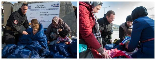 Bij aankomst op Oinousses krijgen de migranten slaapzakken en dekens uitgereikt en worden ze herenigd met de opvarenden van de andere boten. Siemelink en Zijlstra en de opstappers van de marechaussee verlenen eerste hulp aan de kinderen die onderkoeld zijn. “Natuurlijk moet je op dit soort momenten professioneel handelen”, leggen de navigators uit. “Niet met je gevoel. Het verhaal erachter ken je namelijk niet. Wij houden uiteraard wel onze oren en ogen open voor opvallende personen. Interessante informatie spelen we door naar de marechaussee.”