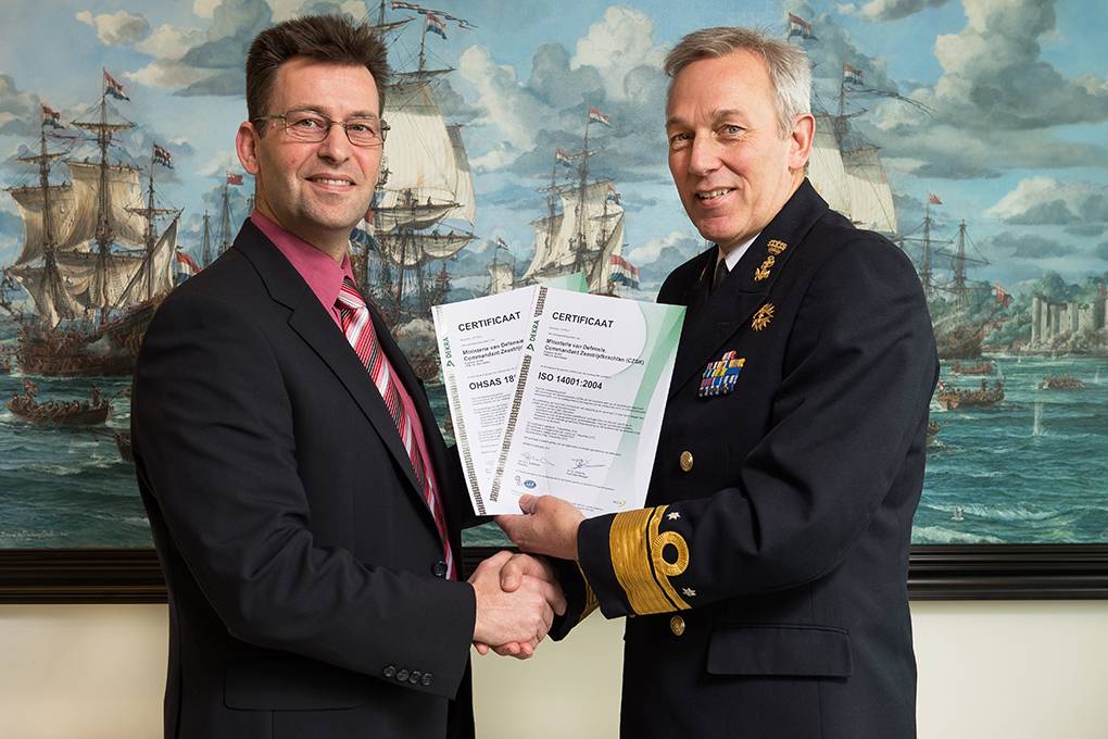 De certificering is overigens geen verplicht nummer binnen Defensie, vertelt kapitein-luitenant ter zee Rob van Vuure, hoofd Stafbureau Veiligheid en Milieu. Het is volgens de overste wel een zeer belangrijke indicatie van hoe er gewerkt wordt. “Sinds 6 jaar werken we met een integraal veiligheidsmanagementsysteem, het genoemde VMMS. Daar hebben we destijds ook meteen de milieuzaken aan vastgeplakt. Door alle CZSK-lagen heen is er de afgelopen jaren veel tijd en inspanning gestoken in het verbeteren van processen. We zijn dus ook voor het zesde jaar gecertificeerd.”