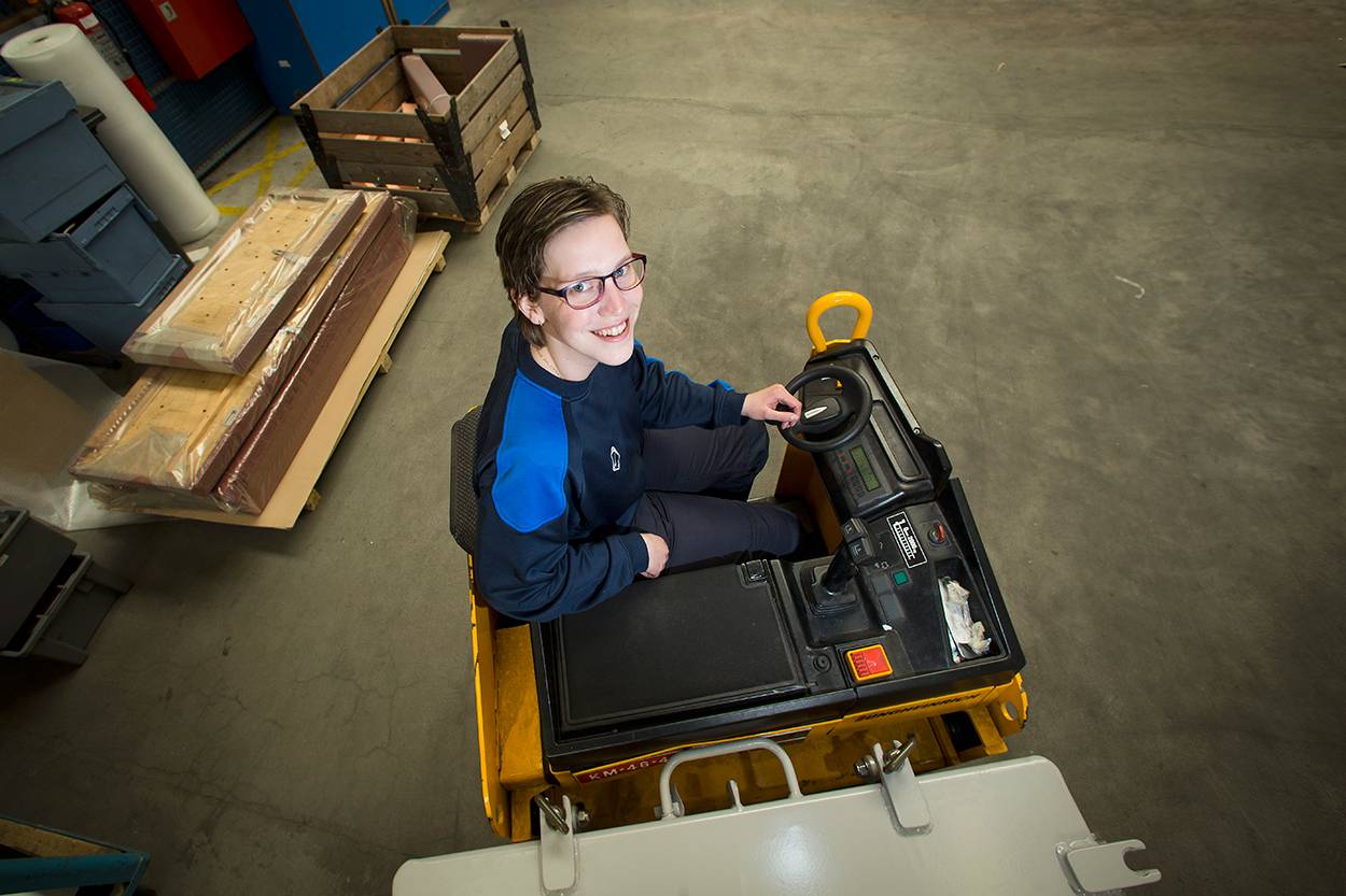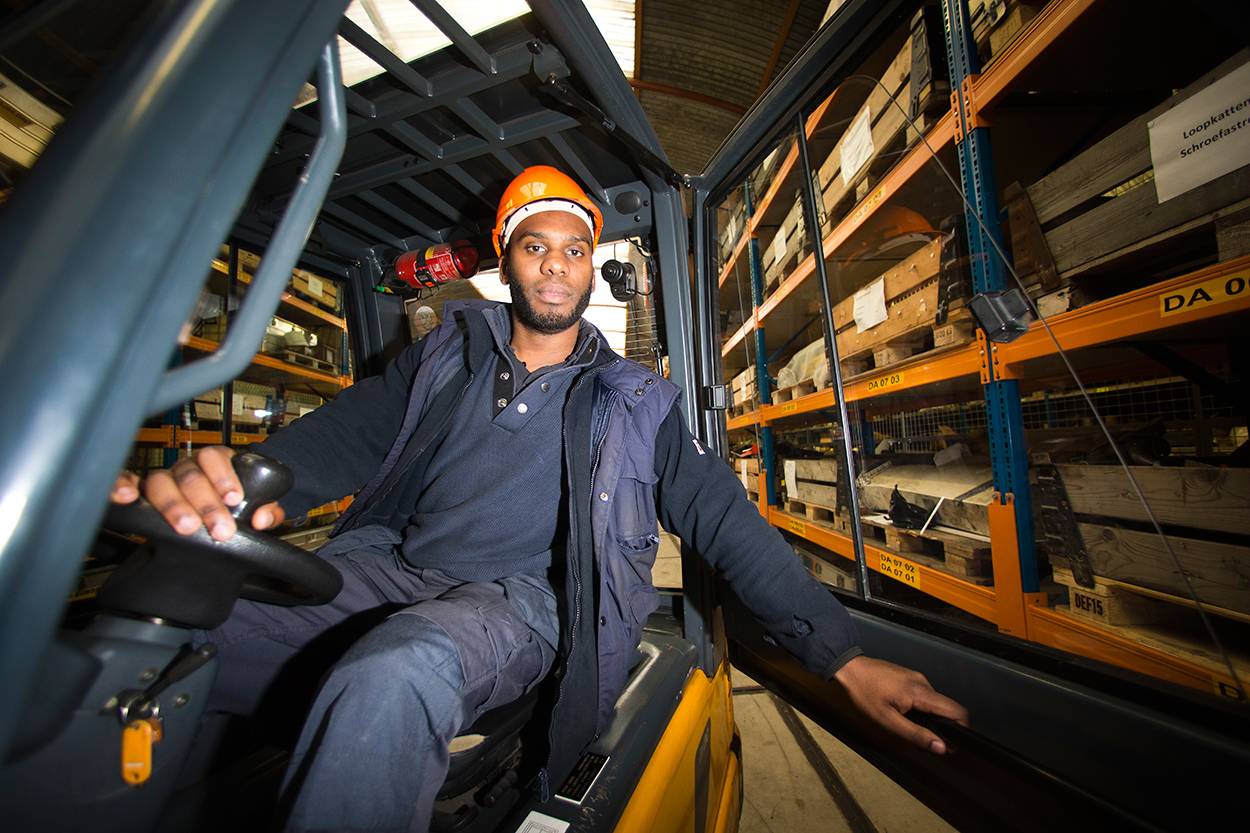 “Ik werk in een opslagloods, waar ik gereedschap en onderdelen van en aan boord breng met een heftruck. Die moeten hier netjes worden opgeborgen. Ik maak volgnummers aan in de computer, zodat alles makkelijk terug te vinden is. Ik ben hier via het UWV gekomen en heb MBO Logistiek (niveau 2) behaald. Na mijn opleiding was zelfstandig werken moeilijk. Ik had meer tijd nodig om alles in de gaten te krijgen. Hier is het relaxed; ze verwachten niet dat je alles meteen begrijpt. Samen met een coach heb ik hier geleerd schema’s te maken en alles op te schrijven, zodat ik niets vergeet.”