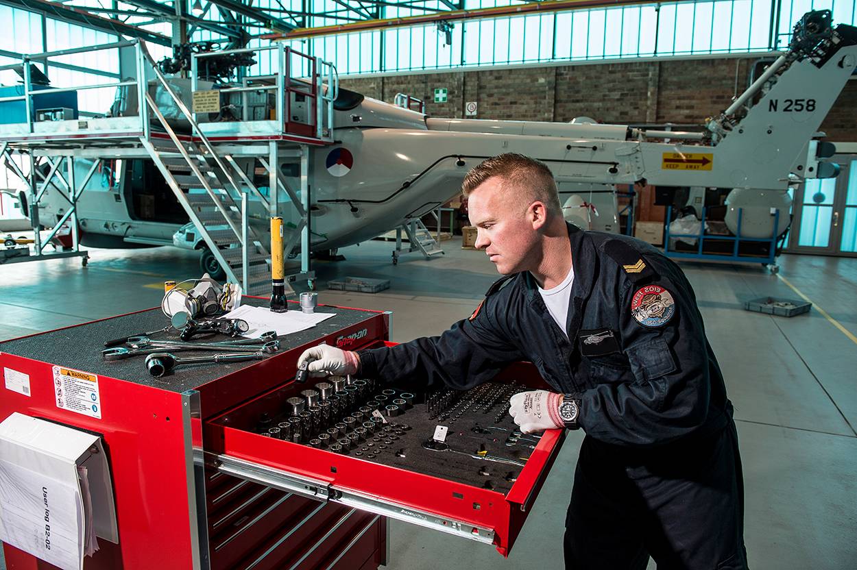 Orde en structuur zijn belangrijk voor helikoptermonteurs. De gereedschapskisten zien er dan ook keurig uit.