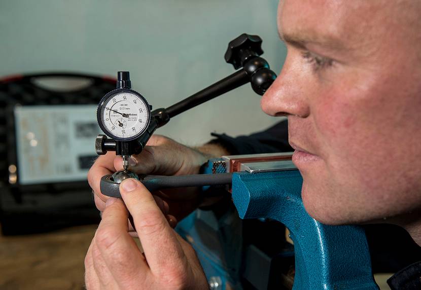 Korporaal Leon meet hier de speling tussen 2 onderdelen van de NH90. H et is belangrijk dat ieder moertje, schroefje of rubbertje correct werkt.