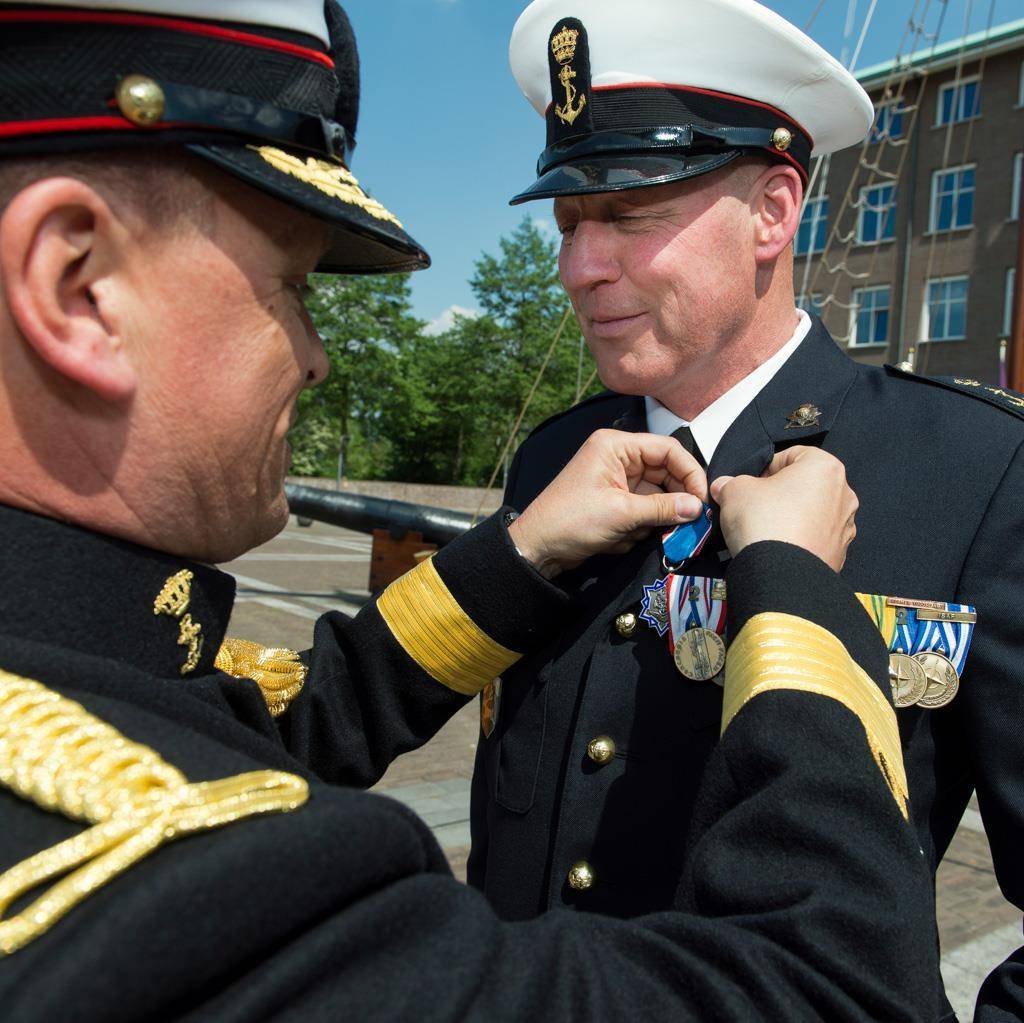 AOOMARNALG Ron van Leeuwen droeg op 13 mei op de Van Ghentkazerne in Rotterdam het marinierssabel van de Korpsadjudant over aan AOOMARNALG Rob van Haastrecht. Van Haastrecht is hiermee de 5e korpsadjudant sinds de invoering van deze functie. De commandant van het Korps Mariniers, BRIGGENMARNS Frank van Sprang, had waarderende woorden voor de terugtredende Van Leeuwen: “35 jaar in dienst van onze maatschappij, in dienst voor onze onderofficieren en in dienst van ons Korps; deze jaren zijn niet onopgemerkt gebleven”, gaf de commandant van het Korps Mariniers, BRIGGENMARNS Frank van Sprang, aan. ‘Met genoegen’ spelde de generaal dan ook het Ereteken voor Verdienste in zilver op het baratea-jasje van de adjudant.