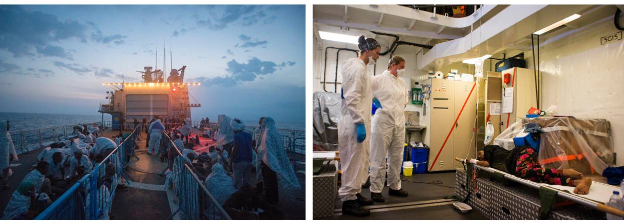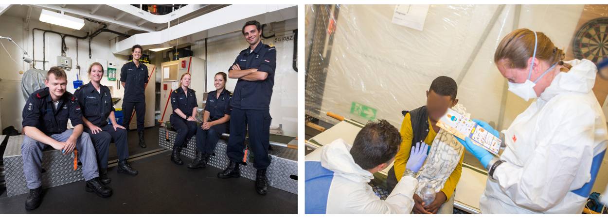 Het medisch team krijgt het flink voor de kiezen, als er migranten aan boord komen. Uitdroging, kneuzingen en zeeziekte vormen het gebruikelijke beeld bij de mensen die de Van Amstel de afgelopen weken oppikte van gammele bootjes. “Op het ene bootje waren de omstandigheden slechter dan op de andere”, constateert scheepsarts luitenant ter zee 2OC (AR) Feiko de Jong.