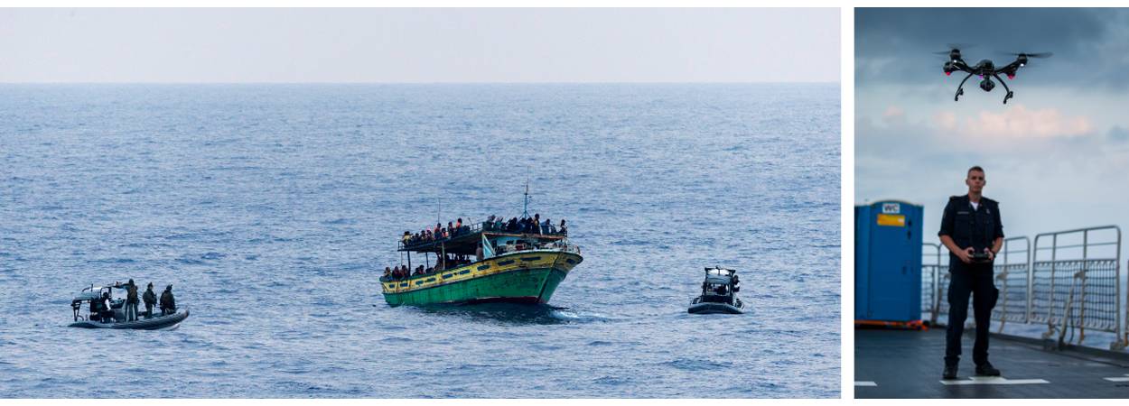 De mariniers pasten de tactiek kort voor de actie aan op basis van ervaringen van andere schepen. “Onlangs is een boot met migranten gekapseisd, omdat iedereen aan één kan ging staan. Dat wilden we natuurlijk voorkomen, vandaar dat we de vaartuigen met 2 RHIB’s (‘Rigid Hull Inflatable Boats’) van beide kanten benaderden.” Dat gebeurde niet zonder verkenning vooraf. Een drone ging eerst over het vaartuig heen om de situatie te beoordelen. “Uit ervaringen van andere schepen weten we dat er lastpakken aan boord zijn; die wil je als eerste aanpakken”, legt korporaal van de mariniers Ruud uit.