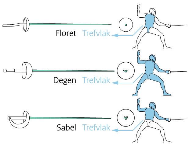 Elk schermwapen is via een ‘fil de corps’ – onder het schermpak – verbonden aan een ‘enrouleur’. Deze meebewegende draad zit vast aan aanwijsapparatuur met lampen, die oplichten bij een score. Met 3 verschillende wapens komt je op steeds andere manier tot scoren: