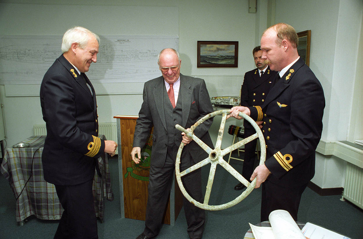 Aanbieding van het stuurwiel van de O 16 aan de commandant van de Onderzeedienst. Het stuurwiel werd, na de vondst van het wrak, in 1995 naar boven gehaald.