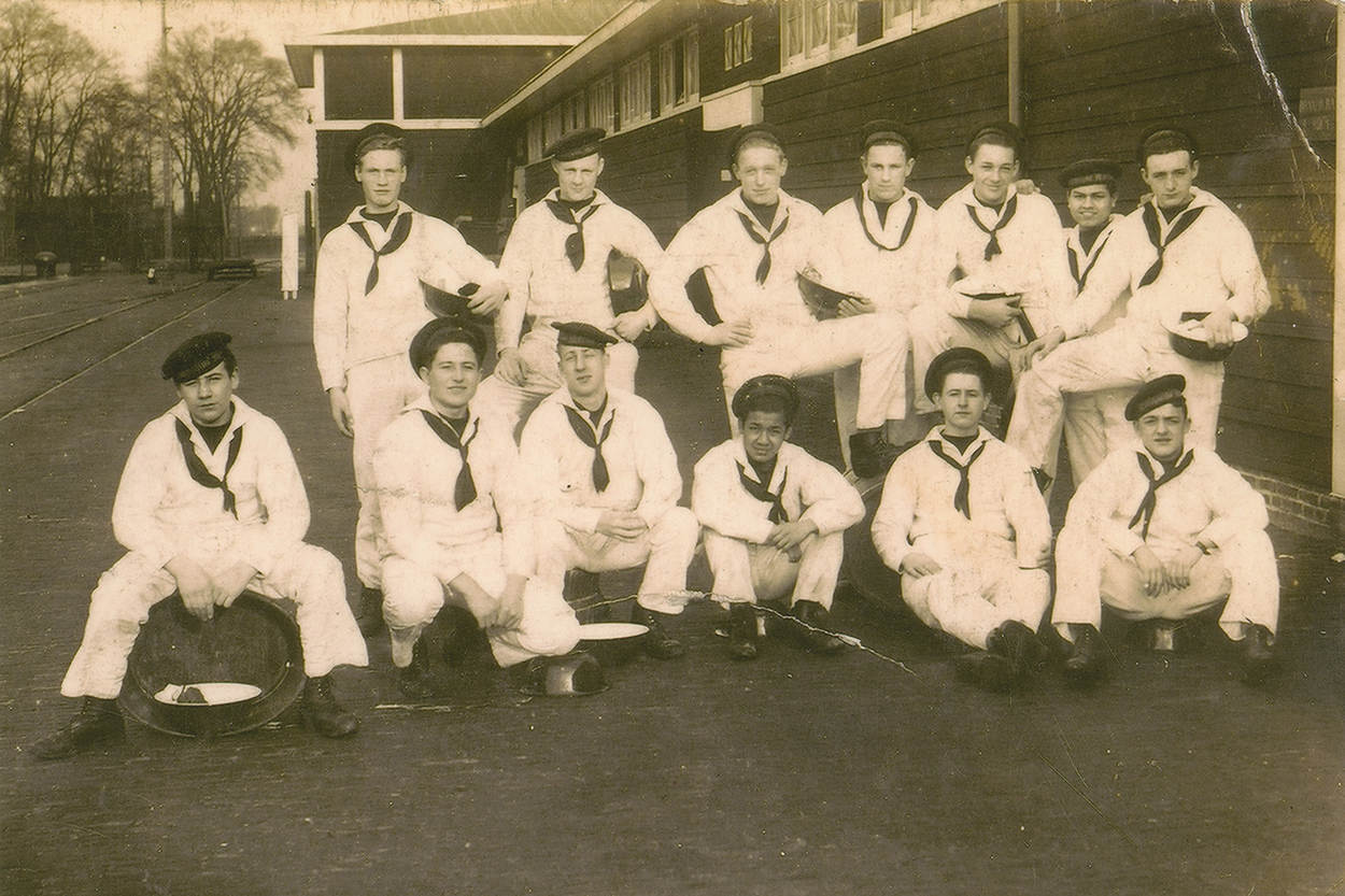 Groepsfoto met geheel links kwartiermeester Cor de Wolf, enige overlevende van de ondergang van Hr. Ms. O 16.