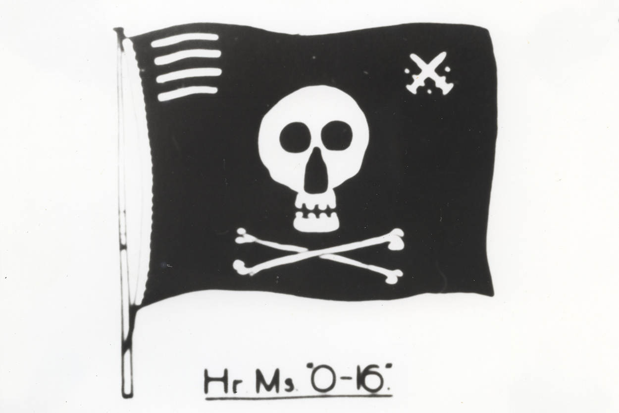 Bloedvlag van Hr. Ms. O 16. De strepen links bovenin geven aan dat de onderzeeboot 4 schepen tot zinken heeft gebracht met torpedo’s.