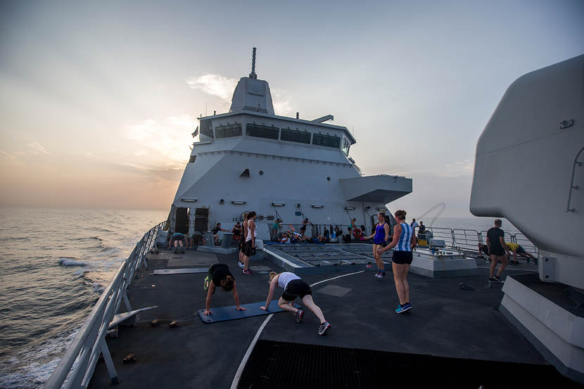De opvarenden van Zr. Ms. Tromp zijn maandenlang op missie bij Somalië. Er staat fitnessapparatuur benedendeks, maar het is natuurlijk veel lekkerder om op rustige momenten in de zeewind te sporten. Beetje improviseren, maar dat is de bemanning zo te zien wel toevertrouwd. (Foto: KPLBDAV Jasper Verolme)