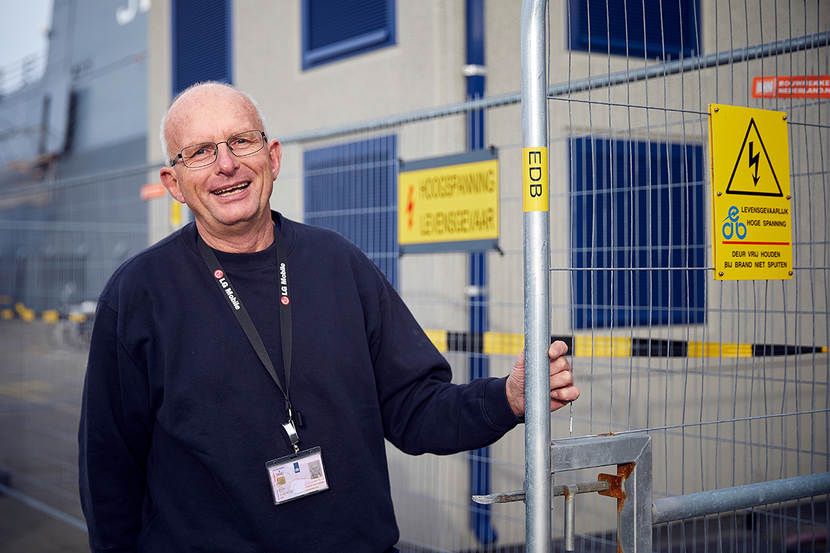 De afwisseling aan werkzaamheden heeft De Jong steeds bij het EDB laten blijven. Terugkijkend: “Vroeger werkten we met gigantische units met gelijkspanning; nu is er meer variatie in apparatuur en dus ook taken. In het dok hiernaast hebben we het Belgische M-fregat Leopold I gisteren aangesloten op het net. Een ander moment begeleid je bijvoorbeeld het leggen van kabels of nieuwbouw door externe aannemers. Of je bent bezig om storingen te verhelpen. Dat kan ook tijdens consignatiedienst, die we 1 week per 4 weken hebben. Dan word je opgeroepen als er ergens een kabel ‘eruit klapt’ of een ander defect zich voordoet. Ook sluit je de schepen aan die na vastwerken afmeren in de haven.”