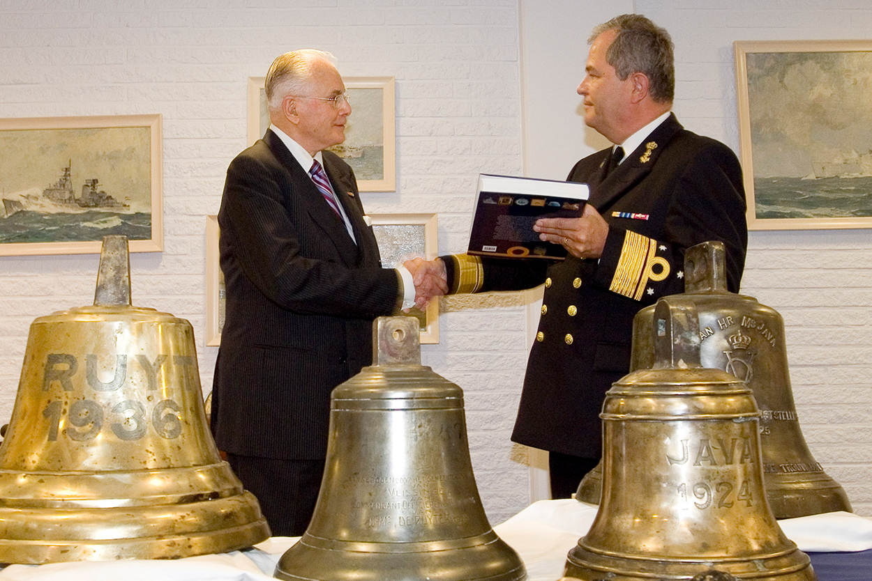 In 2005 kreeg toenmalig Bevelhebber der Zeestrijdkrachten VADM Ruurt Klaver de opgedoken scheepsbellen van de De Ruyter en Java aangeboden. Inmiddels zijn de bellen de enige tastbare restanten van de schepen. (Foto: Mediacentrum Defensie)