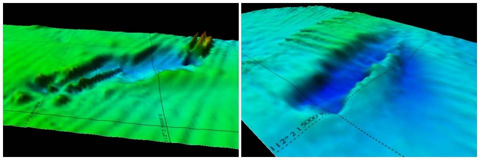 Links: Sonarbeeld van de locatie waar het oorlogswrak van Hr. Ms. De Ruyter eerder nog lag. Rechts: Sonarbeeld van de locatie van waar het oorlogswrak van de Java is verdwenen. (Beelden: Karel Doormanfonds)