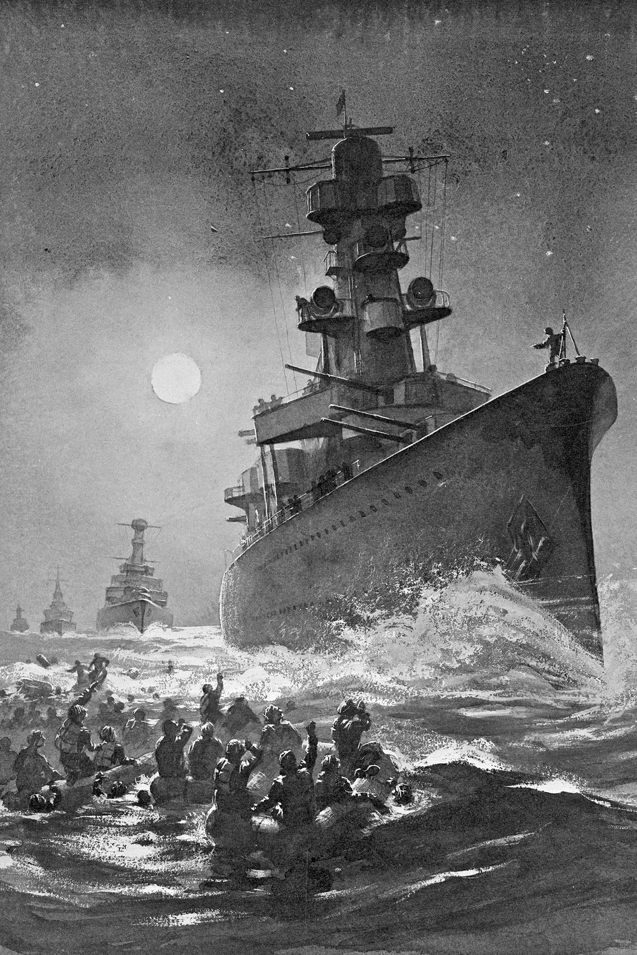 Tot Jans’ teleurstelling kwam die niet van Hr. Ms. De Ruyter en Java en 2 buitenlanders die in het donker met hoge snelheid langs voeren. “Ook al zaten de Japanners op hun hielen, ze hadden moeten stoppen voor hun kameraden”, stelt Jans, boos. “Ik vond dat géén werk! Vierenhalf uur later zijn we toen uiteindelijk opgepikt door de Britse HMS Encounter. We werden aan land gebracht in Surabaya, waar we droge kleren kregen.”