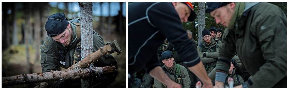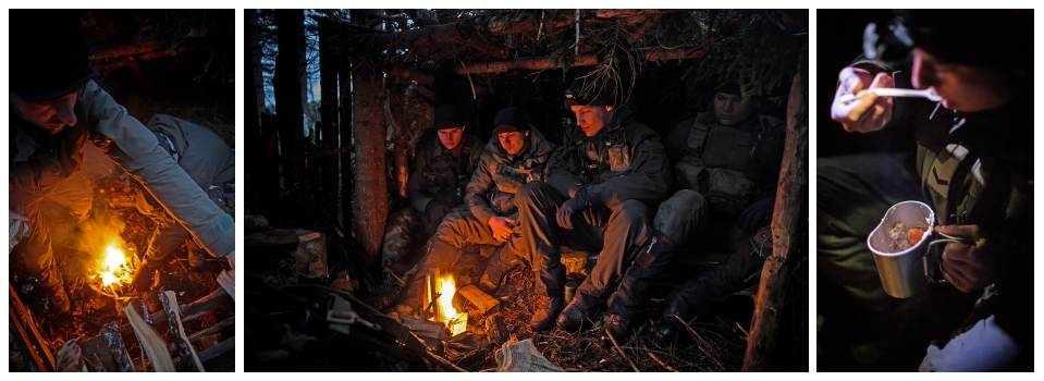 Overnachten in een tentje of in een geïmproviseerd onderkomen in het bos of in de sneeuw; het maakt de mariniers weinig uit. Beschutting, een vuurtje en warm eten, het betekent aan het eind van een lange dag in het veld een weldadige luxe. En als je dan al in je slaapzak kruipt, is dat niet in de eerste plaats om je slaaptekort in te halen, vertelt Daniël. Handschoenen, sokken en andere kleding gaan mee. “Zodat ze kunnen drogen voor de volgende dag.”