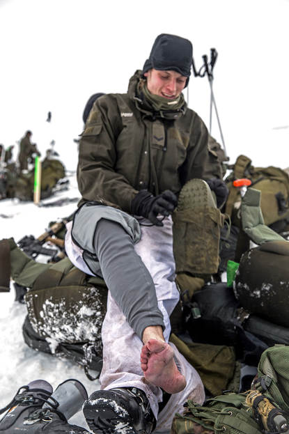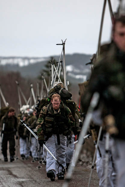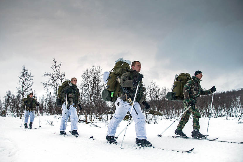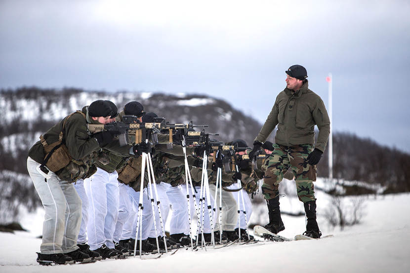 Kapitein der mariniers Martijn Sluis, trainingsofficier: “Ze hebben alles gehad in deze novice-fase: droge kou én nat weer. Dat maakt deze wintertraining eigenlijk des te realistischer. Dit zijn de omstandigheden waarin wij terechtkomen met onze amfibische operaties. Je hebt altijd invloed van de zee. Het gevecht spelen we, maar het overleven in en verplaatsen door het terrein is echt. Dat zie je ook terug in deze fase, de combat enhancement-trainingen. Routes zijn niet altijd begaanbaar voor medische afvoer of bevoorrading. Dus moeten de jongens nu daadwerkelijk nadenken. We nemen de actualiteit deels mee in de wintertraining. Zoals militante rechts-extremistische clubs die vanwege de vluchtelingenstromen zorgen voor oplopende spanningen. Een Russische dreiging maakt geen deel uit van het scenario. Onze trainingsdoelstellingen zijn gewoon hetzelfde als andere jaren. Zoals de burgemeester van Harstad zei: ‘We vinden het fijn dat jullie er zijn, maar hopen jullie pas volgend jaar weer voor jullie training terug te zien, niet voor the real thing.’”