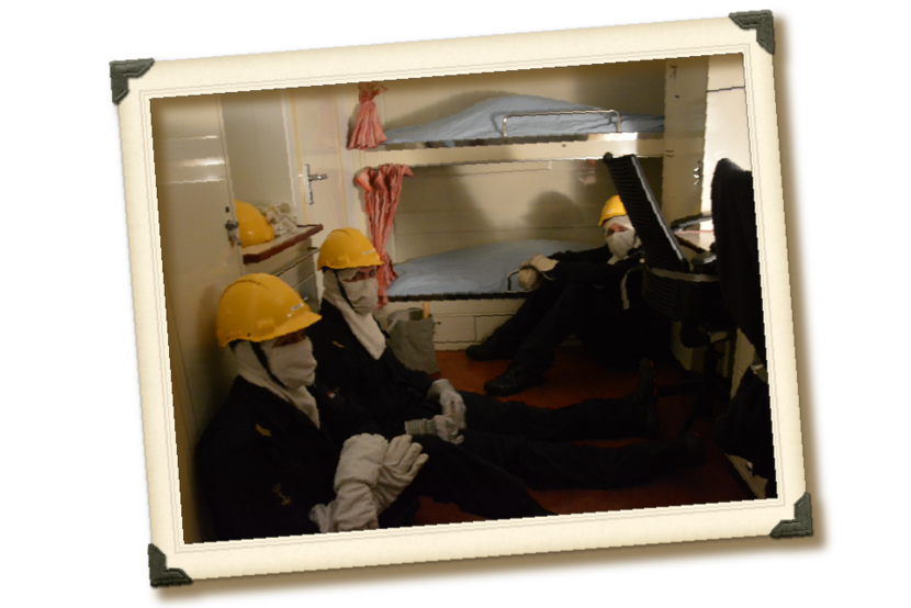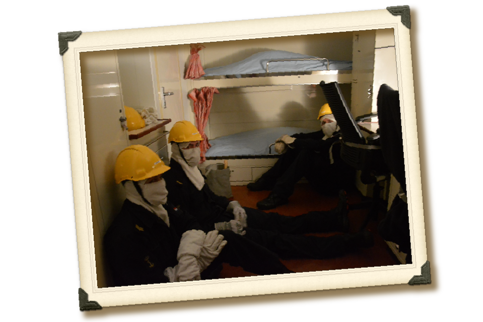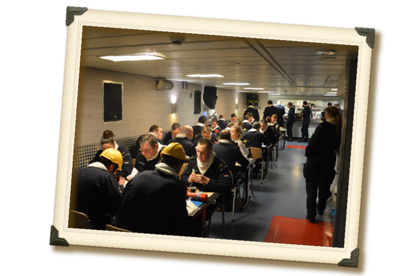 “Het is de weekly war! Het schip krijgt allerlei uitdagingen voor z’n kiezen. Van onderzeebootdreiging tot brand aan boord. Rondom het schip vliegt en vaart van alles rond en in het schip worden rampscenario’s met rookmachines, stroomuitval en ‘gewonden’ zo realistisch mogelijk nagebootst. Het hele schip is aan het vechten om de situatie onder controle te houden. Dan moet er ook snel gegeten worden: action messing. De bemanning is verdeeld in 4 groepen die ieder 7 minuten hebben om te eten. Een mooi moment voor mij om mensen kort te zien en sfeer te peilen; en de sfeer zit er goed in! Mooi om te zien dat alle diensten, rangen en functies willekeurig bij elkaar aan tafel zitten. Bij de uitgang wens ik iedereen een ‘prettige oorlog!’.”