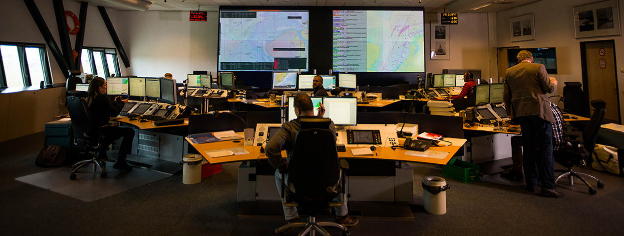 Foto onder: De meldkamer van het Kustwachtcentrum op Marinebasis Den Helder.