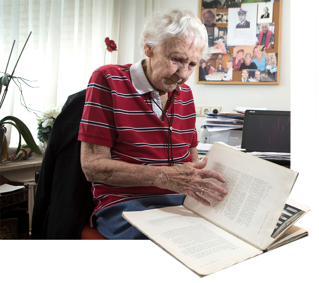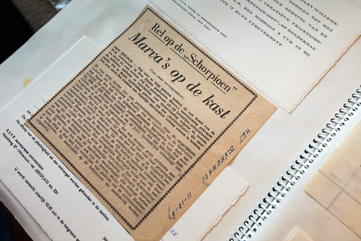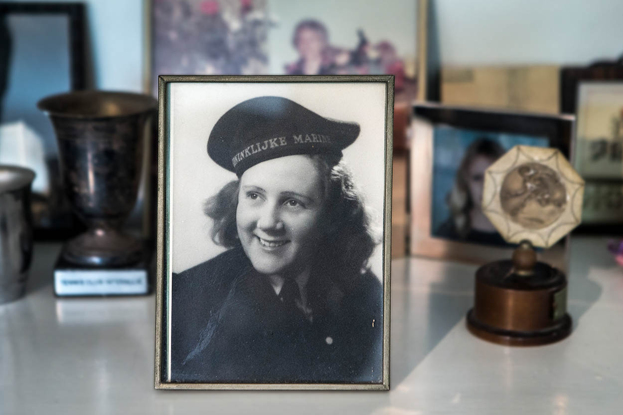 Het duurt even voordat de deur opengaat van de kamer van de 92-jarige LTZ 2OC b.d. Mas Massizzo, die verblijft in een sfeervolle woonzorgflat in Baarn. De kleine kamer herinnert op allerlei manieren aan haar rijke verleden bij de Koninklijke Marine. Op een kastje liggen een scheepsklok en het embleem van Hr. Ms. Schorpioen, boven het bed prijkt een schilderij van het schip en in de vensterbank liggen stapels plakboeken. Overal herinneren zwart-wit foto’s aan haar ‘blauwe’ geschiedenis.