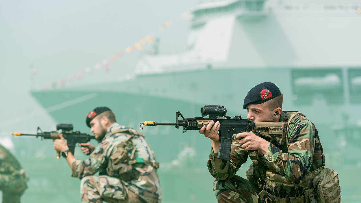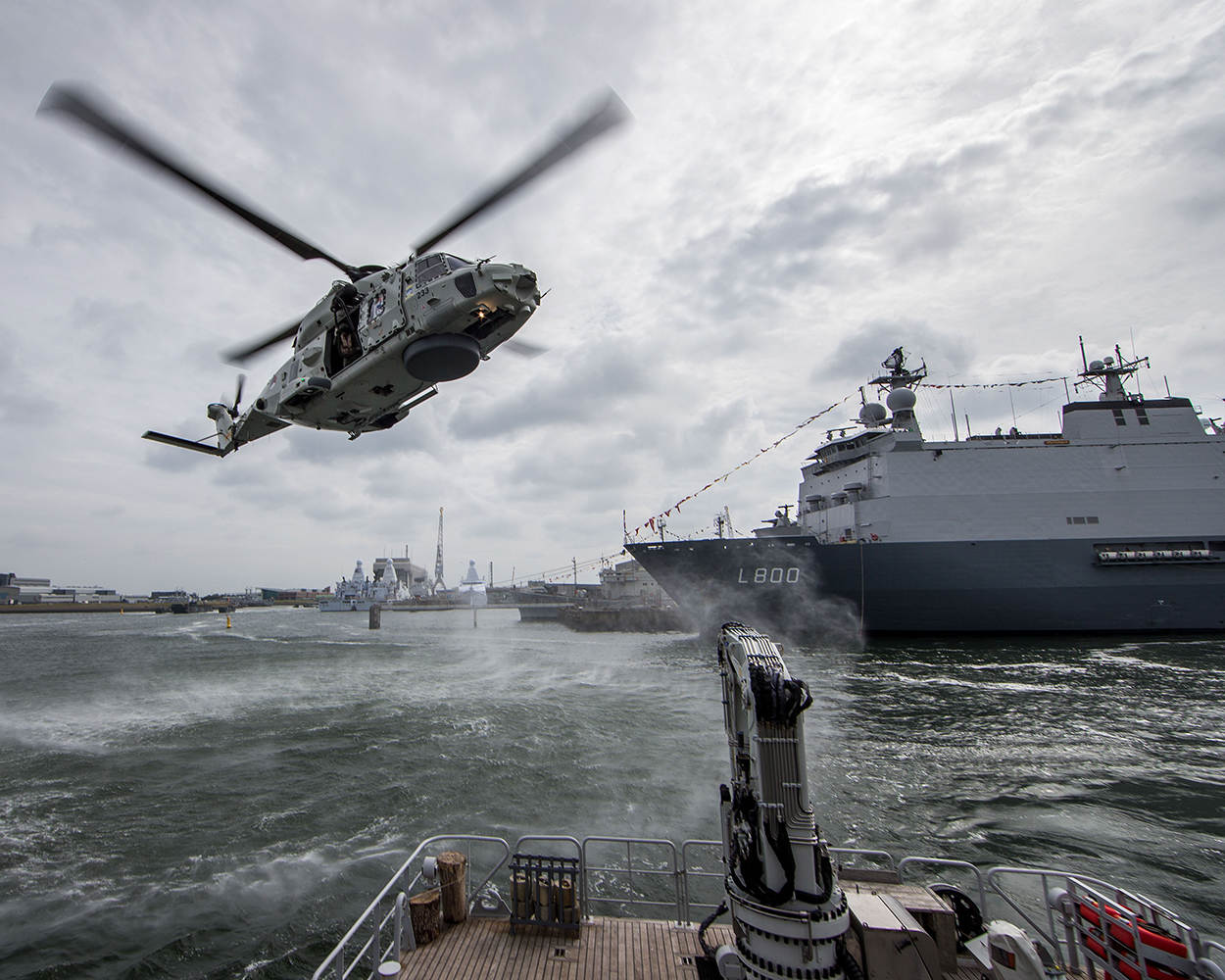“Kijk pap, een echte helikopter!”, de 5-jarige Wim wijst vanaf de Rotterdam naar de lucht. Uit de NH90 maritieme gevechtshelikopter bungelt een touw. Een marinier laat zich zakken en springt aan boord van het schip onder hem. Een zwarte vlag met wit doodshoofd wappert aan de mast. Piraten uitschakelen, dat is een van de scenario’s tijdens de demonstraties van onder meer het Korps Mariniers. Zij showen ook hun amfibisch optreden. Met landingsvaartuigen en in een waas van groene rook betreden zij het ‘vijandelijke gebied’, de Nieuwe Haven.