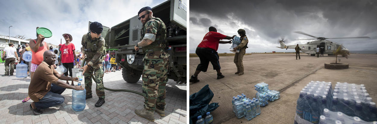 Links: mariniers distribueren zoetwater-uit-zeewater op Sint-Maarten, ‘gemaakt’ door de Zeeland en de Pelikaan. Rechts: Ook Saba kampte met een tekort aan drinkwater.