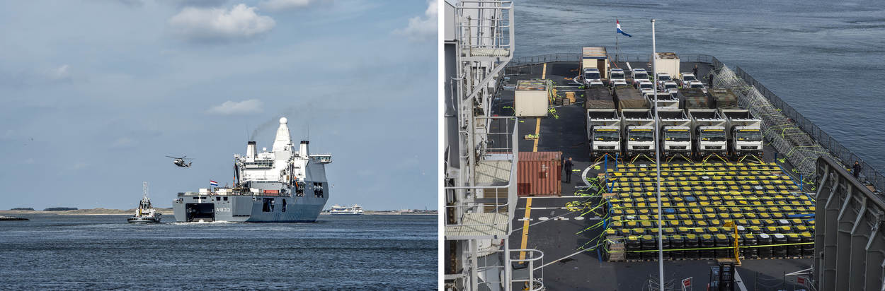 Inmiddels in het Joint Support Ship Zr. Ms. Karel Doorman afgeladen met hulpgoederen onderweg naar de Bovenwindse Eilanden.