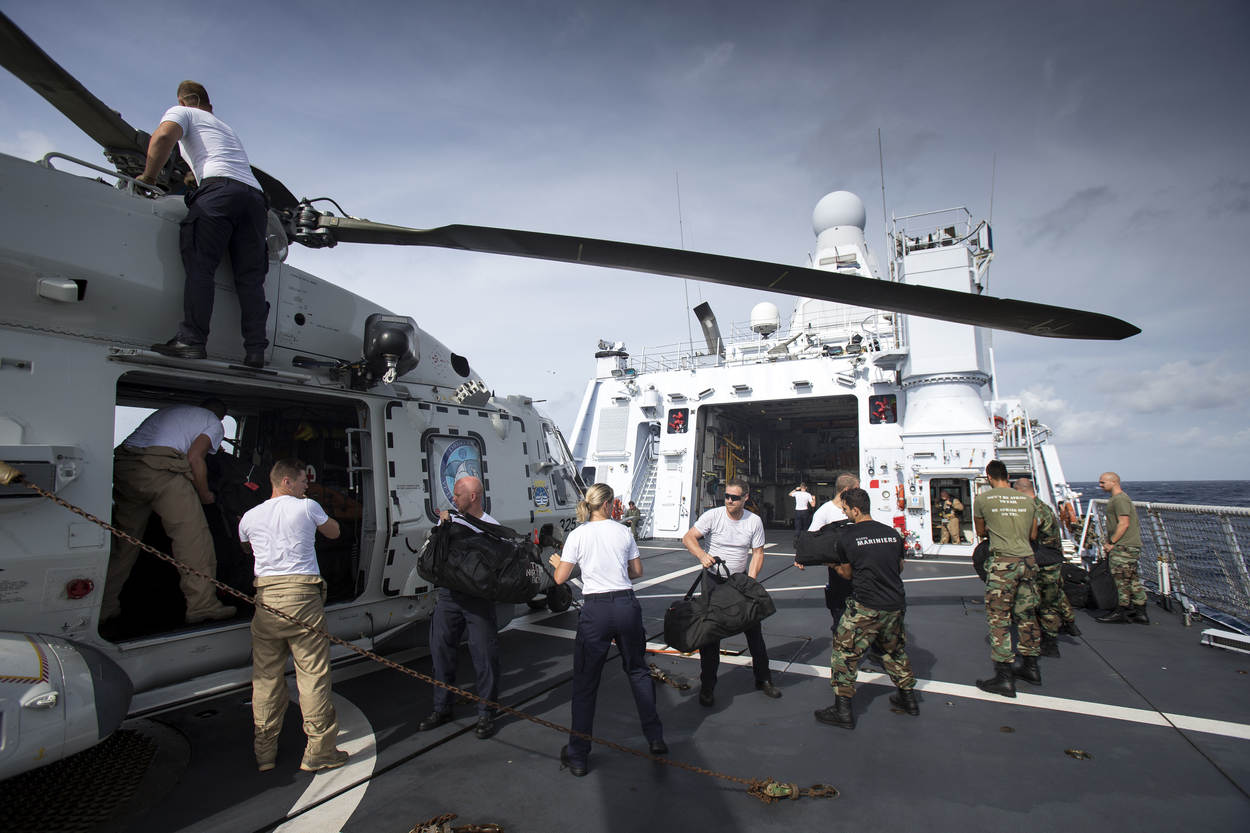 Opvarenden van de Zeeland beladen de NH-90 met uitrusting voor de militairen aan land.