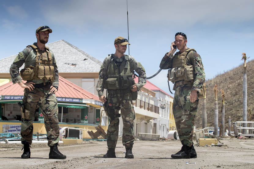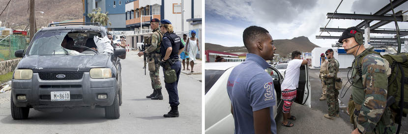 Direct na de storm verspreiden de mariniers en genisten van het Damage Assesment Team van 11 Luchtmobiele Brigade zich over het eiland. “Aan ons de taak om te helpen de openbare orde te handhaven”, vervolgt Prins. “Onze mensen bewaken shelters met schuilende bewoners en de buitenring van de gevangenis. Als 10 van de 12 cipiers vertrekken om thuis poolshoogte te nemen, nemen we ook de binnenring voor onze rekening.”