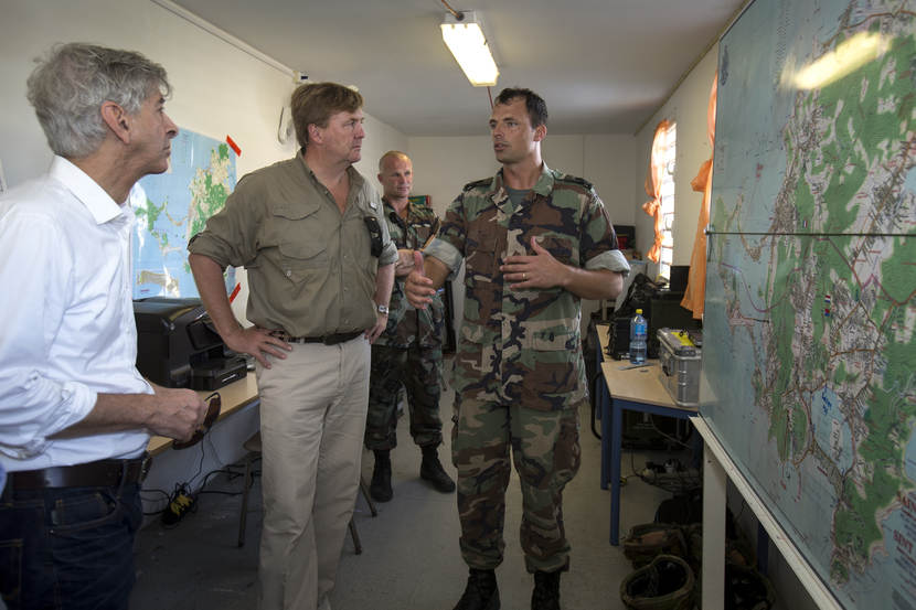 MAJMARNS Prins legt de stand van zaken op Sint-Maarten uit aan koning Willem-Alexander en minister Ronald Plasterk van Binnenlandse Zaken en Koninkrijksrelaties.