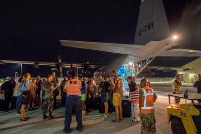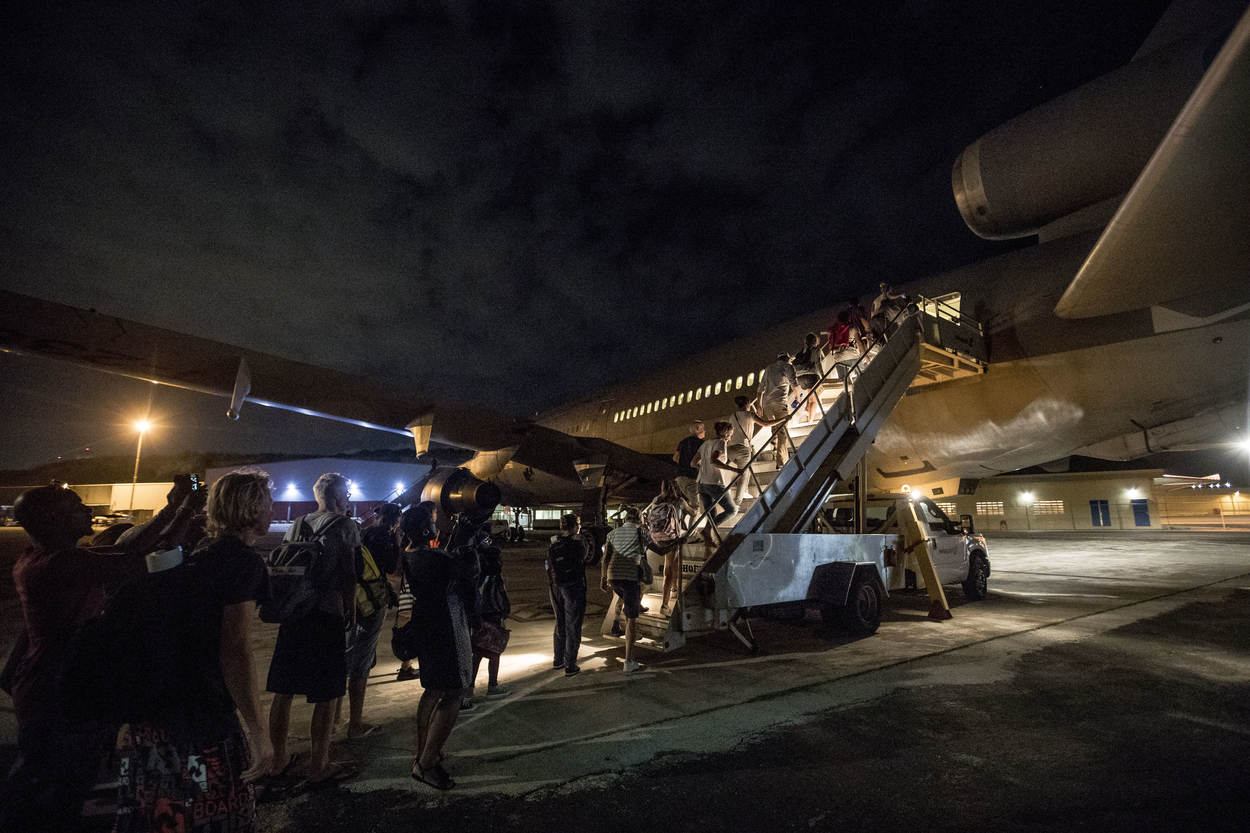 Adjudant Neelen (foto links, midden) begeleidt de evacuees vanuit de C-130 naar de bussen. Daarna vertrekken ze met de KDC-10 naar Nederland.