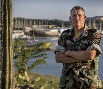 ‘Waar begin je als zo’n orkaan over komt?’, is de voor de hand liggende vraag aan dé militaire autoriteit in het Caribisch Gebied. “Met de bewustwording dát er een aankomt”, antwoordt brigadegeneraal der mariniers Peter Jan de Vin. “Zowel bij de militairen als bij de overheden van de eilanden. Die laatste doen een verzoek tot bijstand dat via de minister van Defensie bij mij terechtkomt. Via de formele lijn dan, maar informeel heb ik natuurlijk al eerder contact met hen zodat ik kan adviseren over welke militaire capaciteiten wij beschikbaar hebben.”