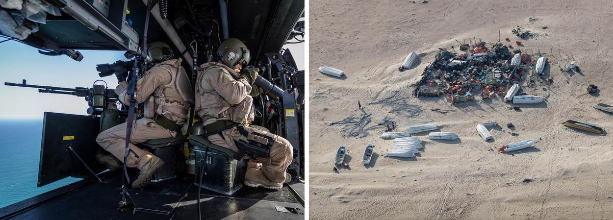Informatie verzamelen is één van de belangrijkste taken tijdens deze missie. De Cougar vliegt bijna dagelijks uit voor Intelligence Surveilance and Reconaissance (ISR)-vluchten. De boordhelikopter is als ‘ogen en oren van de vloot’ onmisbaar voor Atalanta. Per vlucht maken doorgunner en rescue operator tientallen gedetailleerde foto’s van dorpen en schepen om een inschatting van eventuele dreiging te maken. “We analyseren de patterns of life van de bevolking”, vertelt vlieger Jimmy. Somalië heeft een lange kustlijn. Die brengen de ‘fotografen’ samen met Spaanse en Italiaanse collega’s (ook ingezet binnen Atalanta) zo volledig mogelijk in kaart. “We zien tentenkampen, samenscholingen en boten die wel of juist niet uitvaren. En één keer langsvliegen, is niet voldoende. Dat is slechts een momentopname. We willen zien wat er verandert.” De afdeling Intell analyseert aan boord in de Amphibious Operations Room de foto’s, voordat hogere echelons ermee aan de slag gaan. Zo kan sneller worden besloten om (vissers)boten in de buurt een vriendelijk bezoek te brengen.