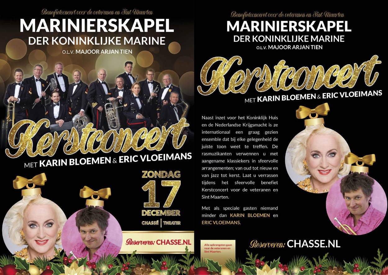 Zondagavond 17 december verzorgt de Marinierskapel van de Koninklijke Marine (MARKAP), met speciale gasten Karin Bloemen en Eric Vloeimans, een sfeervol kerstconcert in het Chassé-theater in Breda. De rasmuzikanten verwennen u met aangename klassiekers in sfeervolle arrangementen; van oud tot nieuw en van jazz tot kerst. De opbrengst van dit concert is bestemd voor de veteranen en de wederopbouw van Sint-Maarten. Kaarten via: https://www.chasse.nl/theater/programma/sfeervol-kerstconcert.